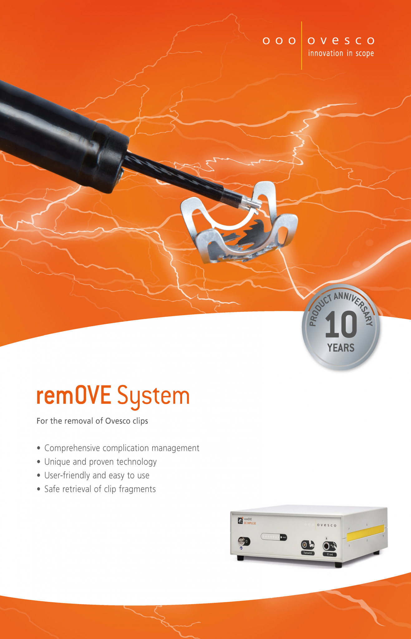 The remOVE System is the only system to easily remove clips from the gastrointestinal tract. It consists of various components, including the remOVE DC Impulse Generator, which generates a direct current impulse, the DC Cutter, which cuts the clip using direct current, and the SecureCap, which securely retrieves the clip fragments. For this purpose, the remOVE Grasper is used as a grasping instrument to secure the clip fragments in the SecureCap. The system also includes the remOVE Shield*, which protects the endoscope lens from flying sparks.